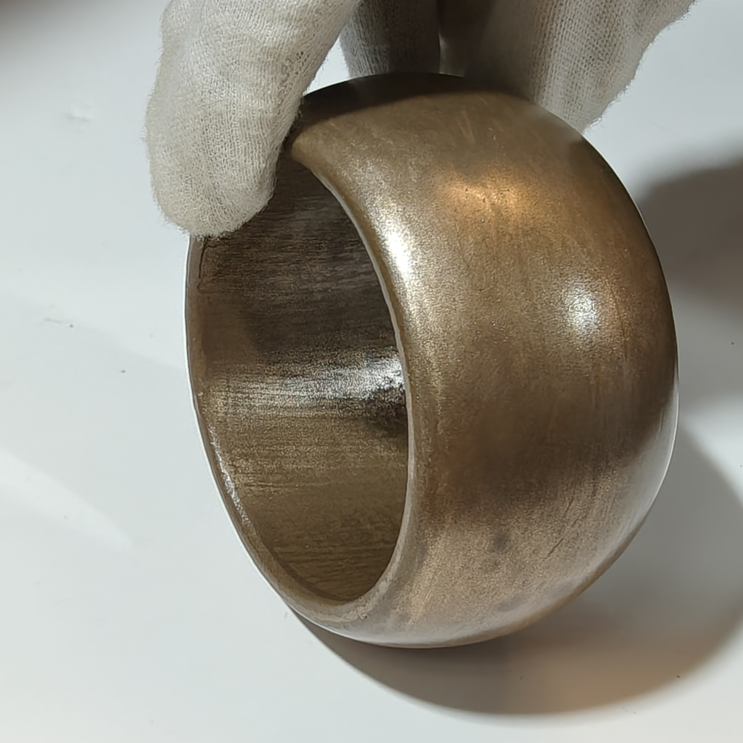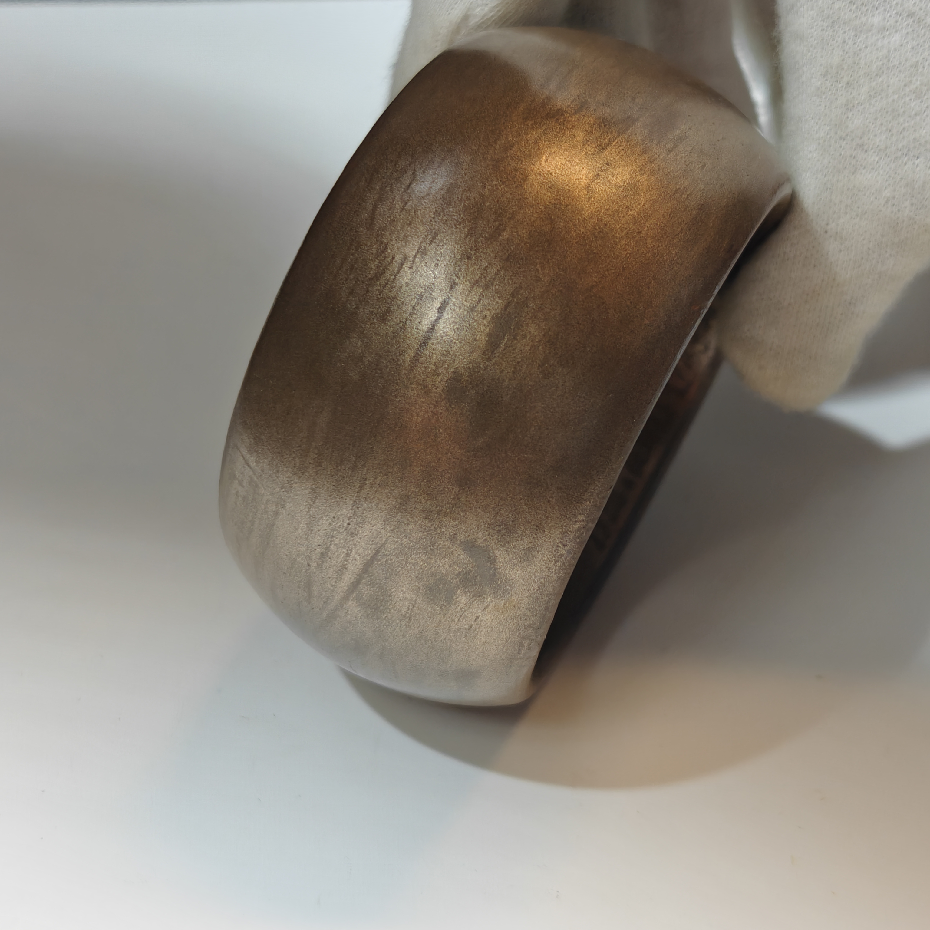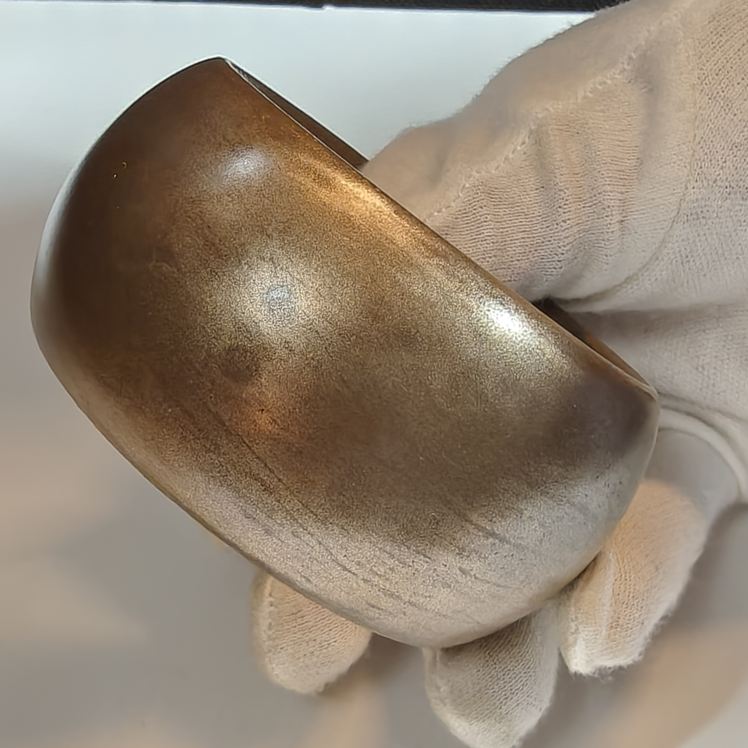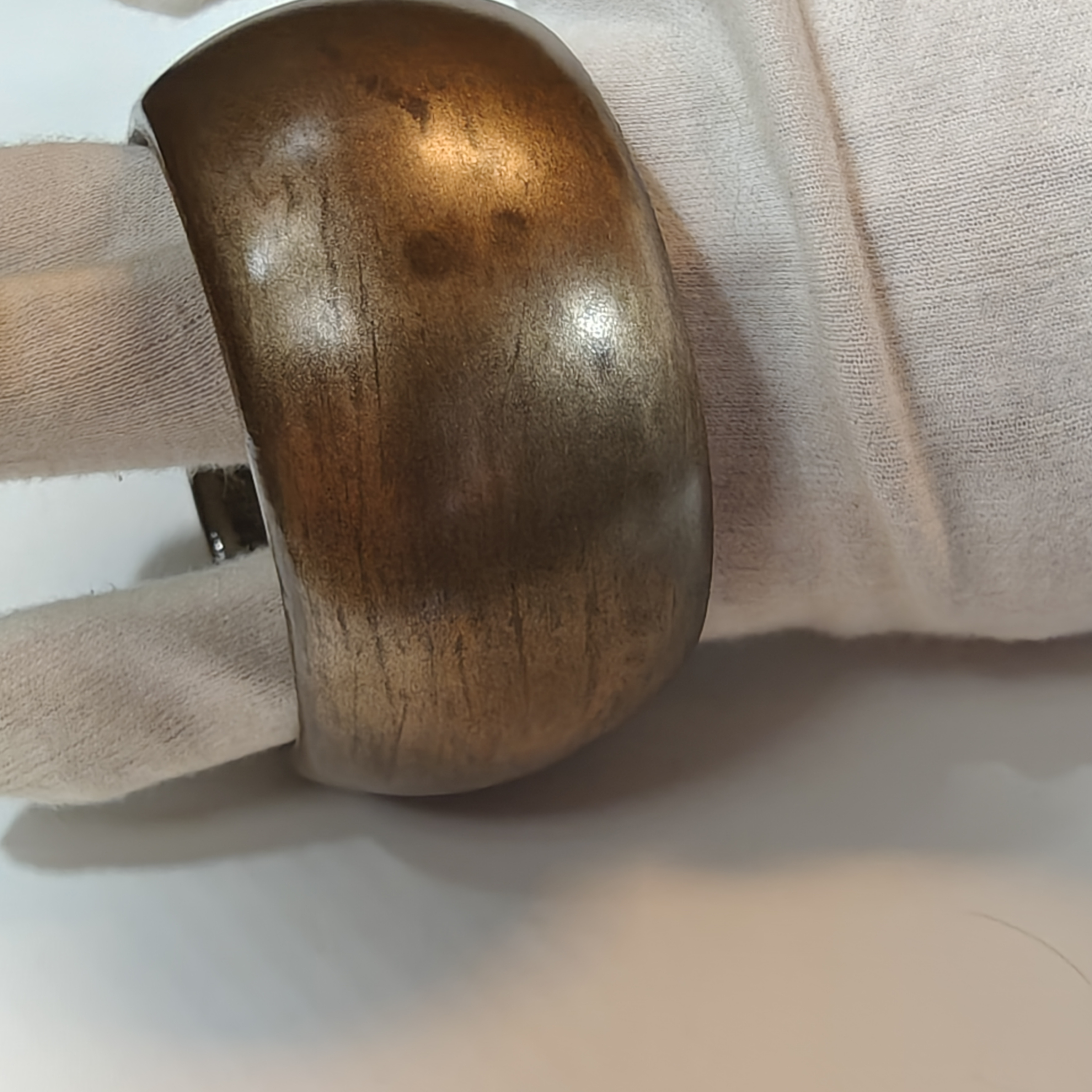 Radome nenaudojamas, senas medines apyrankes ir, pasitelkę specialią technologiją, padengėme (metalizavome) jas ryškiu bronzos sluoksniu. Tai suteikia joms modernų, industrinį atspalvį, išlaikant lengvą ir patogų medžio pagrindą. Tai aksesuaras, kuris neabejotinai trauks dėmesį ir taps puošmena jūsų kolekcijoje.